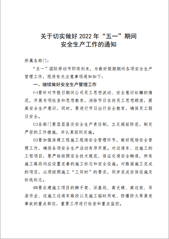 關于切實做好2022年“五一”期間 安全生產工作的通知